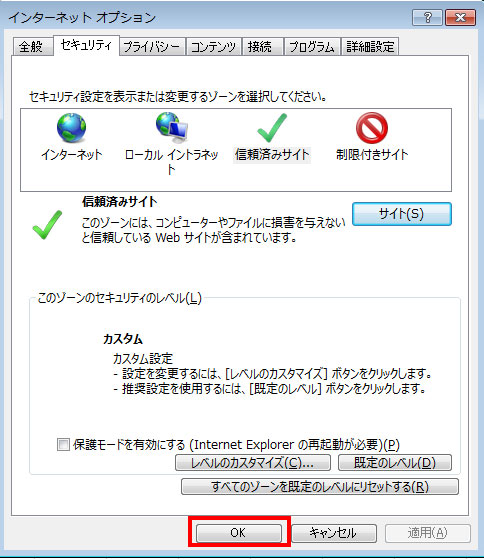 「信頼済みサイト」が選択されていることを確認し、「レベルのカスタマイズ」ボタンをクリックして下さい。