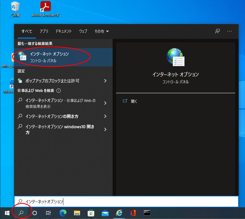 検索窓に「インターネットオプション」と入力すると表示される 「インターネットオプション」をクリックします。